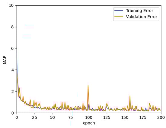 Another experiment was performed to assess the proposed model using two-thirds training and one-third testing data splits. Figure 5 shows the mean absolute error resulting from both the training and validation datasets. The figure assumes that the model is not overfitted to the data and that the results hardly change after the 50th epoch, thus it was sufficient to stop the training at 200 epochs. The results obtained from the one-third testing will be used in the analytical results presented in the following section.