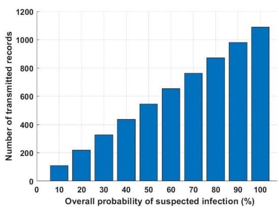 For the proposed model, as mentioned in Section 2.3, there could be up to 1089 people detected by one RFID reader at a time. The number of the transmitted records depends on the percentage of possibly infected visitors based on the overall probability of satisfactory and unsatisfactory conditions. Figure 6 depicts the number of required transmitted records that should be sent, saved, and tracked. As shown in Figure 6, it is worth mentioning that the required saved data increases when the overall probability of suspected visitors in the area covered by an RFID reader not following the required safety precaution increases. For example, when 5% of visitors in an area did not satisfy the precaution conditions, then the reader will send around 55 records to be stored at the base station. However, if this percentage is increased to 20% then the reader has to send around 218 records to the base station for storing the data for future tracking if necessary. Additionally, if all the visitors did not satisfy the required precaution conditions, therefore 100% unsatisfactory conditions, then 1089 records should be sent and stored at the base station.