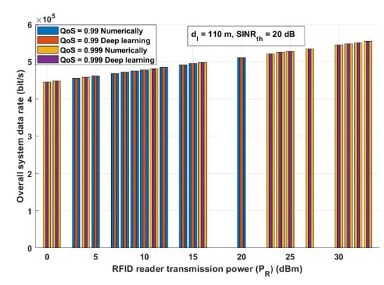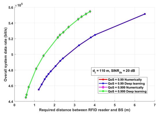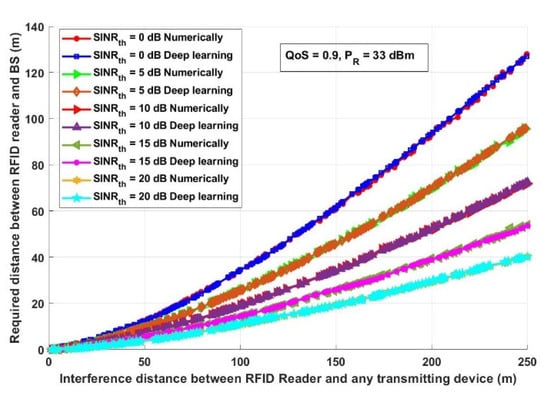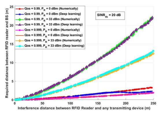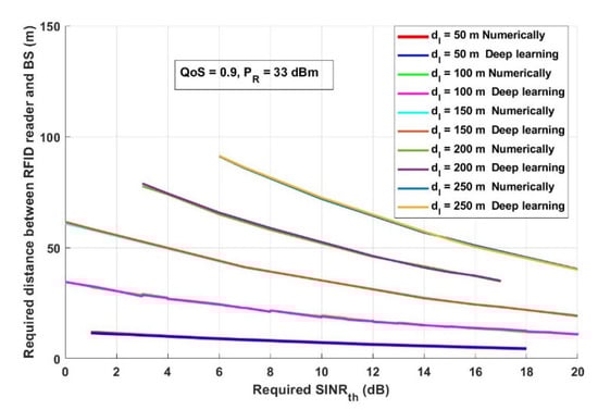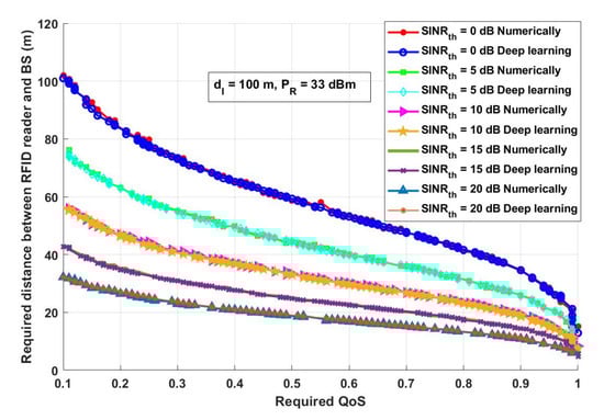 It can be seen from the result presented in Figure 9, that increasing the required system QoS decreases the required transmission distance between an RFID reader and a BS. Additionally, it can be noticed that increasing the QoS with SINRth increasing dramatically decreases the required distance between an RFID reader and a BS, as this is considered as a very high network requirement that should be obtained with the minimum required distance to overcome the loss that could happen due to a long transmission distance. As it can be mentioned from Figure 9, for the five assumed SINRth which are 0, 5, 10, 15, and 20 dB if the required QoS is 0.9, the required transmission distance between an RFID reader and a BS will be approximately 11.13 m, 14.29 m, 19.09 m, 25.31 m and 34.47, respectively, using numerical and using the deep learning model. This result is correlated with the results obtained previously, which showed that to achieve a high system performance, the distance between an RFID reader and a BS should be adapted based on the system requirement and channel conditions.