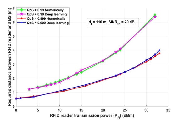 It can be concluded from Figure 12 and from the results obtained from the numerical and deep learning model that, to achieve the highest system QoS, the interference distance should be predicted to allocate the RFID reader at a suitable distance from the BS. This distance must be determined based on the RFID reader transmission power. For example, assuming the worst-case scenario, which is having an interference distance (dIBS) of 50 m and the required QoS of 0.999, then the required distance between an RFID reader and a BS should be less than 1 m when the transmission power (PR) is 0 dBm, while it is required to be 1.16 m when PR is 33 dBm. On the other hand, when the interference distance increases for example becomes 250 m, then the required distance between an RFID reader and a BS is 1.91 m for PR equals 0 dBm and between 12.42–13.11 m for PR equals 33 dBm.
