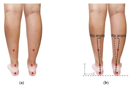 Schematic diagram of (a) positioning markers on each participant’s lower back of the leg and (b) measurement methods of rearfoot alignment.