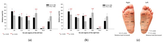 The relative loads of six subregions of (a) left and (b) right feet in total participants during the midstance phase of walking. Description of changes in pressure distribution is illustrated in (c) plantar diagram. Through independent sample t-test, * p < 0.05 and ** p < 0.01 are significantly different between the control group and the PF group.