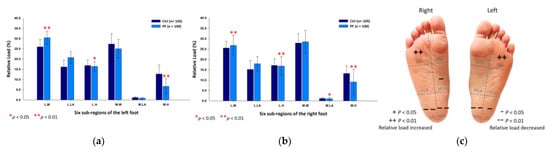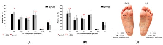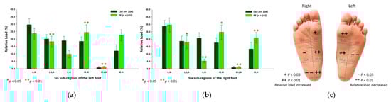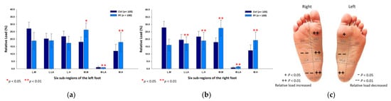 The relative loads of six subregions of (a) left and (b) right feet in total participants in bipedal static stance. Description of changes in pressure distribution is illustrated in (c) plantar diagram. Through the independent sample t-test, * p < 0.05 and ** p < 0.01 are significantly different between the control group and the PF group. The six subregions and their abbreviations are as follows: LH, lateral heel; LLA, lateral longitudinal arch; LM lateral metatarsal bone; MH, medial heel; MLA, medial longitudinal arch; and MM, medial metatarsal bone.