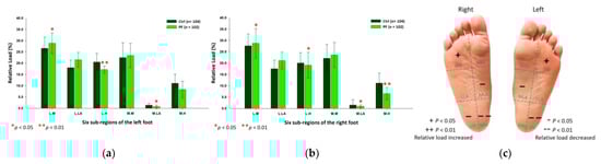 The female PF group identically reflected upon the higher relative loads at the medial metatarsals (left foot: 24.46 ± 5.13%; right foot: 24.69 ± 4.91%; p < 0.05) and the medial longitudinal arches (left foot: 1.37 ± 0.37%; right foot: 1.35 ± 0.29%; p < 0.01) of both feet, and the medial heel (20.97 ± 3.54%; p < 0.01) of the right foot; yet, they had lower relative loads at the lateral longitudinal arches (left foot: 18.21 ± 3.74%; right foot: 18.00 ± 4.32%; p < 0.05) of both feet and the lateral heel (9.78 ± 2.44%; p < 0.01) of the right foot (Figure 5).