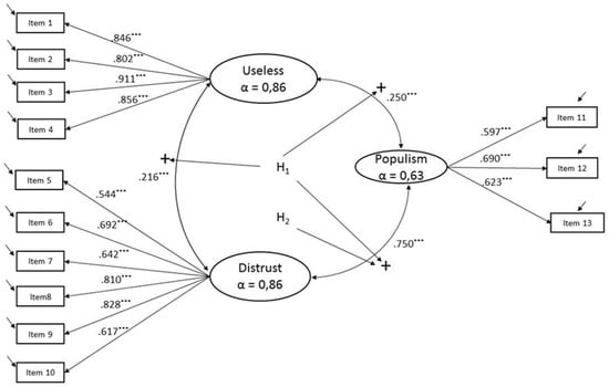The survey measured vaccine usefulness (Cronbach’s Alpha = 0.86) using four items. Each item—“To what extent do you agree or disagree with the following statements …” Item 1. “It is important for everybody to have routine vaccinations”, Item 2. “Not getting vaccinated can lead to serious health issues”, Item 3. “Vaccines are important not only to protect yourself but also others”, Item 4. “Vaccination of other people is important to protect those that cannot be vaccinated …”—was measured on a four-point scale ranging from 1 “Totally agree” to 4 “Totally disagree”. As the scale was reversed, we named the latent variable obtained from these indicators as USELESS. We included six items for measuring trust (Cronbach’s alpha = 0.77)—“… how much trust you have in certain media and institutions…” Item 5. “The media”, Item 6. “Political parties”, Item 7. “Regional or local public authorities”, Item 8. “The national government”, Item 9. “The national parliament”, Item 10. “The European Union”. Respondents expressed their agreement with these statements on a two-item scale from 1. “Totally agree” to 2. “Totally disagree”. As the scale was also reversed, we choose to name the resulting latent variable as DISTRUST. Finally, the survey asked the interviewees three questions that formed POPULISM (Cronbach’s alpha = 0.63). The first one (Item 11), measured on a four-point scale from 1. “Totally agree” to 4. “Totally disagree”, was: “The interests of people like you are well taken into account by the political system in (OUR COUNTRY)”. The second one (Item 12), measured on a four-point scale from 1. “Totally agree” to 4. “Totally disagree”, questioned “On the whole, are you very satisfied, fairly satisfied, not very satisfied, or not at all satisfied with the way democracy works in (OUR COUNTRY)?” The third one (Item 13), asked the participants “At the present time, would you say that, in general, things are going in the right direction or in the wrong direction, in (OUR COUNTRY)?” We recoded this indicator in 1. “Things are going in the right direction”, 2. “Neither the one nor the other (SPONTANEOUS), 3, “Things are going in the wrong direction”. The measurement model proposed could be seen in Figure 2.