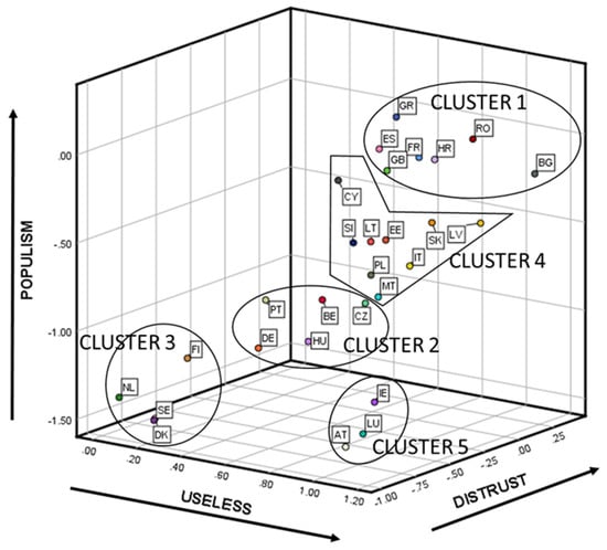 - Cluster 4. The countries related to this cluster were Italy, Poland, Slovakia, Estonia, Latvia, Lithuania, Slovenia, Cyprus, and Malta. POPULISM and DISTRUST exhibited a medium-high level—higher than clusters 2, 3, and 5, and lower than cluster 1. The only statistically significant difference found for USELESS was that previously commented with cluster 3.