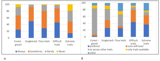 Singletrack was the most frequently used trail type, with over 90% of riders “always” or “sometimes” riding singletrack, followed by difficult trails, flow trails, forest or gravel (Figure 1). Although extreme trails were the least frequently used, in relative terms, nearly half of the surveyed riders reported use of this type of trail. However, there is a clear disparity between use of, and preference for, certain trail types. For example, over three quarters of riders using forest roads or gravel tracks (77.4%), and a third using singletrack (33%) or flow (34%) trails, claim to do so only as a means of accessing other trails. Conversely, a large proportion of riders using difficult and extreme trails do so through preference and alignment with their skill level (79.2% and 64.1%, respectively).