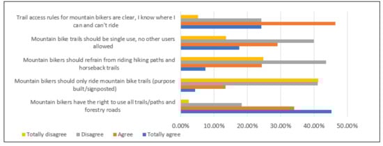 Turning to attitudes and behaviour, most European mountain bikers believe that they should be able to ride on any trail but also that mountain bikers should have exclusive use of certain trails which appears somewhat inequitable. Without presuming to understand why respondents have taken this position, there is an argument to be made that there are safety implications for certain mountain bike trails, especially downhill and jump-oriented tracks where other users might pose a hazard. Furthermore, most riders admit to using illegal or unauthorised trails, extending previous findings from a cohort of Slovenian mountain bikers [16], although there were some differences in frequency and rationale for using illegal trails across the different countries. Perhaps unsurprisingly, use of unauthorised trails is greatest in countries where riders report a shortage of appropriate legal trails. Notwithstanding the issue of varied access rights, several earlier studies have shown that mountain bikes on non-designated trails is a significant source of social conflict [35].