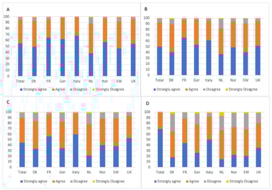 Respondents’ perception of the extent to which their use of mountain bike trails has influenced their attitudes towards nature. (A) Increased appreciation of nature. (B) Increased willingness to protect trails. (C) Taken action to protect nature. (D) Changed behaviour to reduce environmental impact.