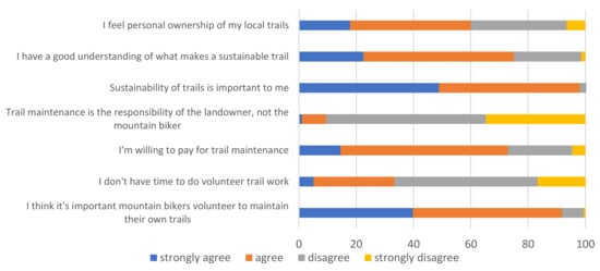 Almost all of the survey respondents reported that sustainability of mountain bike trails is important to them (98%), and three quarters (75%) believe that they have a good understanding of what makes a sustainable mountain bike trail (Figure 5). Additionally, most mountain bikers feel a sense of personal ownership of their local trails (60%), with very few (10%) believing trail maintenance to be the responsibility of the landowner. Similarly, a large majority believe it is important to contribute towards trail maintenance, and 91% believe that mountain bikers should volunteer to maintain trails themselves. However, one third claim that they do not personally have enough time to participate in trail maintenance, but most (73%) would be willing to pay for trail maintenance.