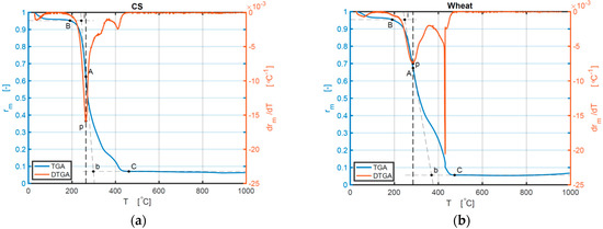 (a–f) TG and DTG curves of the samples of CS, wheat, BR, CCSB, CWB, and CBRB 10 °C/min: (a) TG and DTG curves of CS; (b) TG and DTG curves of wheat; (c) TG and DTG curves of BR; (d) TG and DTG curves of CCSB; (e) TG and DTG curves of CWB; (f) TG and DTG curves of CBRB.