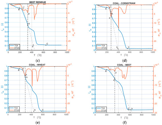 Therefore, adding coal powder into the biomass can slow down the burning velocity of every BM and can also increase the remaining ash fraction. Each DTG curve exhibits multiple dips (the term for the negative equivalent of a peak point on a graph) in the major thermal degradation phases, reporting the change in the reaction rates in the process of burning. The first very small dip value occurs in the temperature scope of 50−200 °C, while the second dip appears at 250−350 °C for BM and 420–530 °C for coal, and a third dip occurs at 400−500 °C for BM and 500–550 °C for coal. Hemicellulose and cellulose are the main chemical constituents in BM, and their thermal decomposition temperature scopes are from 200 to 320 °C, and from 320 to 400 °C, relatively, which is consistent with the combustion curve in Figure 3b. Figure 3b demonstrates that the burning rate of BM is distinctly higher than that of coal in the first and second processes, but the burning rate of coal is highest at the third stage. This is because the polymers of cellulose, lignin, and hemicelluloses are associated with comparably fragile bonds (380–420 kJ/mol energy), which are simple to be resolved [41,42]. Figure 3d shows DTG curves of different blends, which display four stages of mass losses. Stage 1 is the dehydration process, stage 2 is the release and combustion of volatile compounds, and stage 3 belongs to the release and combustion of char oxidation. Stage 4 occurs mostly because of coal combustion [14]. After adding coal powder, CCSB, and CWB have a higher combustion rate at the second and third stages.