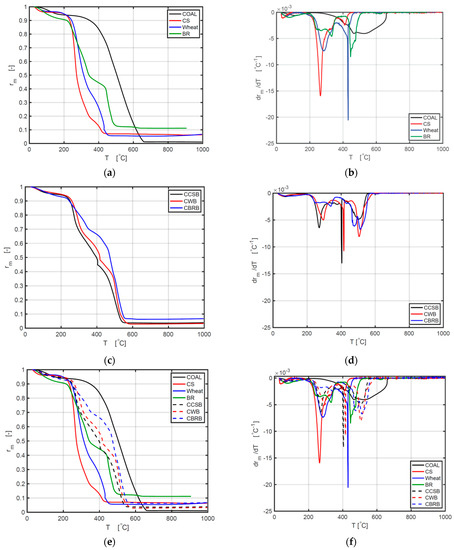 Figure 3a shows a distinction in thermal characteristics of coal, CS, wheat, and BR. The same moisture dehydration scope could be found at about 50–200 °C. The sequence of weight loss between 50 °C and 200 °C is BR > coal > wheat > CS. This is consistent with the moisture contents of samples in Table 1. Figure 3c shows a similar process among thermal behaviors of CCSB, CWB, and CBRB, which is around 7%.