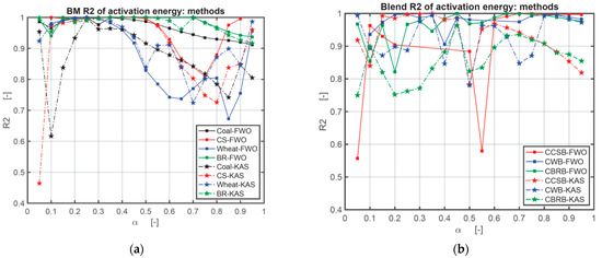 Comparison of correlation coefficient (R2) obtained with FWO and KAS methods: (a) comparison of correlation coefficient (R2) of coal and BM obtained with FWO and KAS methods; (b) comparison of correlation coefficient (R2) of CBB obtained with FWO and KAS methods.