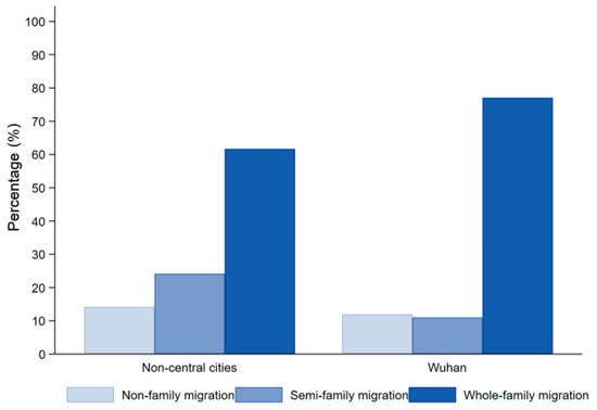 To describe the family migration accurately, we combed this concept further and identified the “spouse & unmarried children” as the core family members. That is, the “family” defined in this study includes “parents and unmarried siblings” for unmarried respondents, and includes “spouse and unmarried children” for married respondents, which means these family members of the respondent form a nuclear family. Following previous studies [10,19], the family migration was categorized by the integrated degree of nuclear family members. We identified three types for family migration analysis. The situation that all nuclear family members have completed the migration is regarded as whole-family migration; the semi-family migration refers to that two or more nuclear family members have completed the migration, but there are missing nuclear family members; only one family member migrating is non-family migration. According to CMDS2017, the proportion of whole-family migration in Wuhan has exceed 75%, which may promote the social integration of migrants. Notably, the percentage of whole-family migration in Wuhan is higher than that in non-central cities, but the percentage of semi-family migration is comparatively lower in Wuhan compared with in non-central cities (Figure 3). The chi-squared test was conducted to assess the statistical difference between Wuhan and non-central cities. The chi-square value was 73.6754 and the p value was close to 0, demonstrating the significance of difference. Additionally, the statistics showed that the whole-family migration accounted for the highest proportion with the size of 1911, including 370 in non-central cities and 1541 in Wuhan City. The other sample sizes were reported in Appendix (See Appendix A).