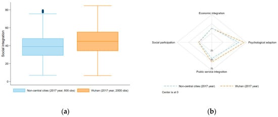 (a) Boxplot of Wuhan and non-central cities in terms of migrants’ social integration in 2017; and (b) scores of Wuhan and non-central cities in terms of social integration’s four dimensions in 2017.