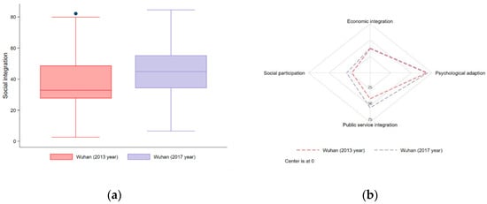 (a) Boxplot of Wuhan in terms of migrants’ social integration in 2013 and 2017; and (b) scores of Wuhan in terms of social integration’s four dimensions in 2013 and 2017.