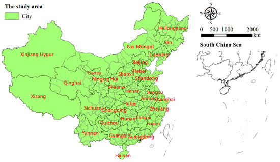 The mainland of China is situated at 4° to 53°30′ North Latitude and 73°40′ to 135°05′ East Longitude, with an area of about 9.6 × 106 km2. The topography is high in the west and low in the east, roughly in a stepped distribution. The west is mountainous and plateaus far away from the ocean, while the east is mostly plains and hills, close to the ocean. China is the most populous developing country in the world. According to the national seventh population census bulletin, its population has reached as high as 14.12 × 108 by the end of 2020. In our study, 321 mainland Chinese administrative entities (cities) were selected, including 287 prefectural–level administrative regions, 30 province–administered counties, and 4 municipalities directly under central government control (Figure 1).
