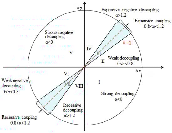 In this paper, the ±20% variation of elasticity values around 1.0 were still regarded as coupling to avoid overinterpreting slight changes as significant [39]. Based on the decoupling elasticity coefficients of a = 0.8 and a = 1.2, eight decoupling states were distinguished (Figure 2). The specific implications about their decoupling states are displayed in Table 1. Take the decoupling states of population and construction land, for example; strong decoupling occurs when construction land growth and population decline (elasticity coefficient is less than zero), indicating that development is extremely irrational. Weak decoupling, expansive negative decoupling and expansive coupling all occur when both construction land and population increase. Among them, the development under the weak decoupling state is not reasonable, which is characterized by the population growth rate is slower than that of construction land (elasticity coefficient is between 0 and 0.8). However, under the condition of expansive negative decoupling and expansive coupling, the development tends to be more reasonable.
