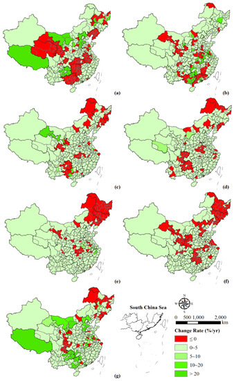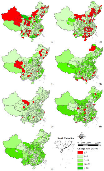 Spatial variation of the change rate of construction land during 1990–1995 (a), 1995–2000 (b), 2000–2005 (c), 2005–2010 (d), 2010–2015 (e), 2015–2018 (f), and 1990–2018 (g). Note: 0–5 is low–speed expansion, 5–10 is medium–speed expansion, 10–20 is rapid–speed expansion, and >20 is high–speed expansion.