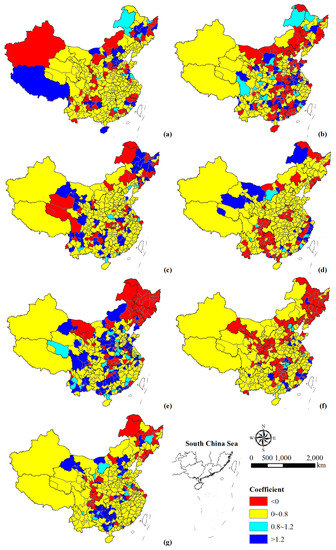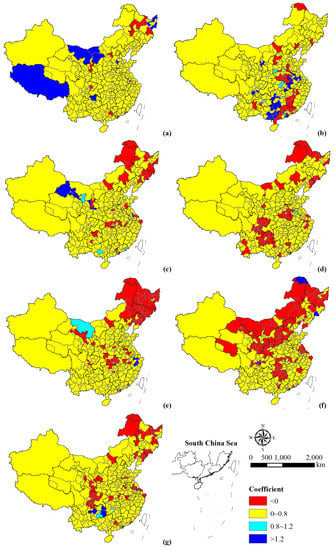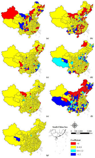 Spatial variation of the elasticity coefficient between construction land and GDP during 1990–1995 (a), 1995–2000 (b), 2000–2005 (c), 2005–2010 (d), 2010–2015 (e), 2015–2018 (f), and 1990–2018 (g).