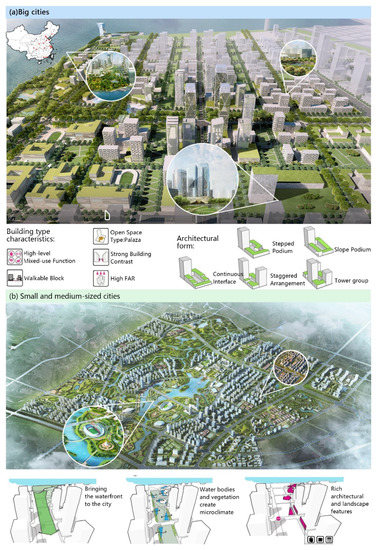 It is a common phenomenon of urbanization process that the growth rate of urban land is larger than the growth rate of population. In this paper, we discussed the differences of the growth rates of construction land and population among cites. We divided Chinese cites to two types, i.e., big cities and small and medium–sized cities, to put forward targeted and creative planning and design solutions (Figure 8). In the study, big cities include Beijing, Shanghai, Guangzhou, Shenzhen, Chongqing, Tianjin, Wuhan, Chengdu, Dongguan, Nanjing, Hangzhou, Zhengzhou, Xi’an, Shenyang, Jinan, Qingdao, and Suzhou, which have an urban resident population of five million or more. Other cities with a population of less than five million are classified as small and medium–sized cities.