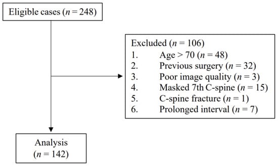 Oh, C.; Noh, C.; Lee, J.; Lee, S.; Hong, B.; Ko, Y.; Lim, C.; Lee, S.Y.; Kim, Y.-H. Diagnostic Accuracy of Magnetic Resonance Imaging for Sagittal Cervical Spine Alignment: A Retrospective Cohort Study. Int. J. Environ. Res. Public Health 2021, 18, 13033. https://doi.org/10.3390/ijerph182413033