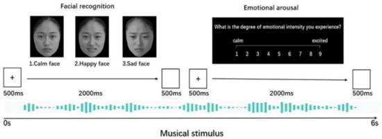 The facial recognition and emotional arousal tasks (Figure 1) were revised by the cross-modal affective priming paradigm [43,46,47,48,50] and were used to measure and evaluate the differences between- and within-groups in the MAEP. The priming stimuli were complete Chinese classical folk instrumental works with three emotional levels (calm, happy, and sad); target stimuli consisted of a combination of 40 pictures of the same faces with three different emotion levels (calm, happy and sad). Participants were required to assess the congruency of the priming and target stimuli as quickly as possible. These facial stimuli were selected from the “Same Face Spontaneous Multiple Expression Pool” [59]. The experimental task was divided into two subtasks (facial recognition and emotional arousal), comprising 160 trials. In the facial recognition task, the pictures with the three emotion levels in the combination are numbered 1, 2, and 3, which corresponded to the keys on the computer keyboard. A fixation point was presented for 500 ms, the three same-face pictures of the three emotional levels were presented simultaneously for 2000 ms, followed by a 500 ms blank screen. The participants were required to press the number keys (1, 2, 3) as quickly as possible. In the emotional arousal task, participants were required to report their intensity of emotional arousal through the number keys (1 “calm,” 9 “excited”), and press the number keys (1–9) as quickly as possible. The fixation point was presented for 500 ms, then the emotional arousal was presented for 2000 ms, followed by a 500 ms blank screen. To eliminate the practice effect, we created a pseudo-random combination of three pictures of the same face (calm, happy, and sad face), and performed the presentation order of the three sub-experiment tasks: calm, happy, and sad music.