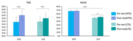 No significant between-group differences in age or sex were found (all p > 0.05). Independent-samples t-tests showed that there was no between-group difference in the PANAS scores (p > 0.05). Repeated-measures ANOVA on TMS scores showed that there was a main effect of measure (Figure 2), F (1, 60) = 13.00, p = 0.001, = 0.18, and the post-hoc t-test displayed that the post-test scores in the TMS total scores were higher than the pre-test. No main effect of group and no interaction between measure and group were observed (all p > 0.05). There was a main effect of group on the MAAS scores (Figure 2), F (1, 60) = 85.34, p < 0.001, = 0.59, and the MAAS scores of the HTG were higher than those of the LTG. This result indicated that the trait level of mindfulness meditation in the HTG was significantly higher than that in the LTG. Additionally, mindfulness meditation training improved the levels of the mindfulness trait among individuals with a low mindfulness trait, and had no significant effect on the level of individuals with a high mindfulness trait. No main effect of measure and no interaction between measure and group were found (all p > 0.05).
