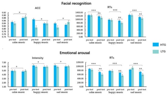 Repeated-measures ANOVA on the ACC of facial recognition found that there was no main effect of measure, musical emotion level, or group (all p > 0.05). In the ACC of facial recognition, there was a marginally significant interaction effect between musical emotion level and measure (F (2, 60) = 3.46, p = 0.06, = 0.06). Simple effect analysis showed that the ACC of the post-test was greater than that of the pre-test in facial recognition for calm and sad music (p < 0.05), with no significant differences in the ACC of facial recognition for happy music. An interaction between measure and group was marginally significant, F (1, 60) = 3.66, p = 0.06, = 0.06, and a simple effect analysis suggested that the ACC of the post-test was greater than that of the pre-test for the LTG (p = 0.02); no significant difference between pre- and post- tests of the HTG was found (p > 0.05). There was no interaction between musical emotion level and group (all p > 0.05).