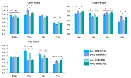 A repeated-measures ANOVA on emotional arousal found that a main effect of musical emotion level was recorded (F (2, 60) = 33.97, p < 0.001, = 0.37), and the emotional intensities of happy and sad music were greater than those of calm music (p < 0.001); there was no significant difference between happy and sad music (p > 0.05). There were no main effects of measure and group (all ps > 0.05). An interaction between measure and group was found, F (1, 60) = 4.51, p = 0.038, = 0.07. Simple effect analysis displayed that emotional arousal in the pre-test was greater than that in the post-test for the HTG (p = 0.027), with no significant difference between the pre- and post-test for the LTG (p > 0.05). There was no interaction between musical emotion level and measure, musical emotion level, or group (all ps > 0.05).