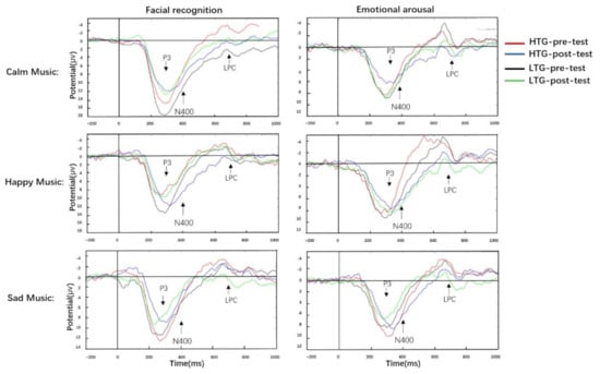Based on previous studies and across-modal emotion processing of the topographical distribution of the grand-averaged ERP activities (see Liu et al., 2021b [27]), their time epochs were selected for analysis: two early time windows from 250 to 500 ms (N400 component [27,46,47,60]) and from 300 to 600 ms (P3 component, [27,54]), and a late time window from 600 to 1000 ms (late positive component: LPC, [27,43,46]). These ERP component latencies were assessed relative to the onset of the auditory stimulus, which included three levels of musical emotion (calm, happy, and sad music). The following regions of interest (ROIs) (see Liu et al., 2021b [27]) were selected [27,54,61]: frontal (F3, Fz, F4), frontal–central (FC3, FCz, FC4), central (C3, Cz, C4), central–parietal (CP3, CPz, CP4), parietal (P3, Pz, P4), and occipital (O1, OZ, O2). For the experimental task, repeated-measures ANCOVA (2 (task: post-test, post-test) × 3 (musical emotion level: calm music, happy music, sad music) × 2 (group: HTG, LTG) × 6 (ROIs: frontal, frontal–central, central, central–parietal, parietal, and occipital sites)) were conducted on the amplitudes of P3, N400, and LPC, with group as a between-subjects factor and task, musical emotion level, and ROIs as within-subject factors. SPSS 22.0 was used to analyze the data. The Greenhouse–Geisser method was used to adjust the p-values for sphericity. The Bonferroni adjustments for multiple comparisons were used to perform post-hoc t-tests.