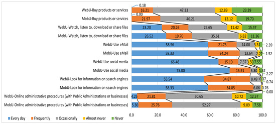 Less than 5% of both profiles have incomes of less than 600 euros per month (MobU, 2.5%; WebU 4.4); in a middle-income level (601 to 1800 euros), there are 49.2% MobU and 44.4% WebU; finally, in the highest income level (more than 1800 euros), there are 48.4% MobU and 51.2% WebU. Therefore, both profiles are located on a medium-high social level in terms of income. That contrasts with the overall situation of Spain, which is not so favorable.