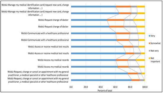 Again, there were no great differences in the importance attributed to each eHealth service, although MobU tended to assign them more value and importance. There were fewer in that group who responded that these services had “No importance” (7.3% compared to 10.1% for WebU) and 66.2% of MobU considered all the services “very important”, compared to 63.2% of WebU.