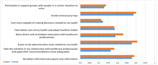 This information may induce ideas of greater concern for health, and subsequent monitoring, as well as more online interaction with medical administrations. In any case, we can highlight that MobU generally had a more positive outlook and greater sense of the potential and capacity of ICTs than WebU, though both profiles considered the existence and promotion of online health services to be important going forward. According to the results, WebU attitudes were more expectant than convinced, while MobU were more cyber-optimists [], as reflected in their scores for satisfaction with services.