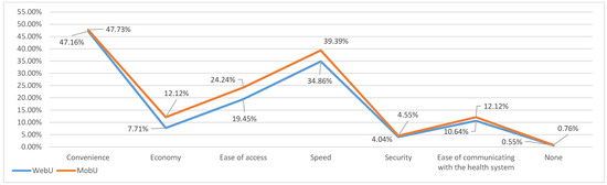 Though the results for both groups were again fairly equal, MobU placed greater emphasis on the potential of ICTs, with especially noteworthy differences in the response concerning “more direct and immediate interaction with healthcare professionals”. This may be related to MobU’s appreciation of videoconferencing with medical professionals (which was highlighted in the previous graph) and easier administrative processing.
