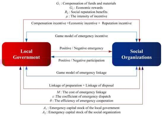 In this article, we built an evolutionary game model focusing on the local government and social organizations in their emergency response to natural hazards. In order to clarify the specific expression of the local government’s emergency strategy and social organizations’ participation strategy in the emergency incentive game model and the emergency linkage game model, the following hypotheses are proposed. The game relationship between the local government and social organizations is shown in Figure 1.