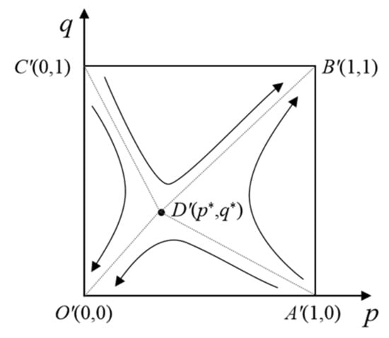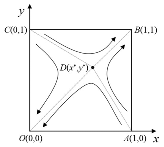 The replication dynamic equation can reflect the behavioral interaction of both game subjects and the direction and speed of the strategic game. When the replication dynamic equation of both game subjects is 0, the replication dynamic system forms an equilibrium state. Therefore, setting F(x) = 0 and G(y) = 0, five equilibrium points of the replication dynamical system of the emergency incentive game model can be obtained, which are O (0, 0), A (1, 0), B (1, 1), C (0, 1), and D (x*, y*), respectively, including , .