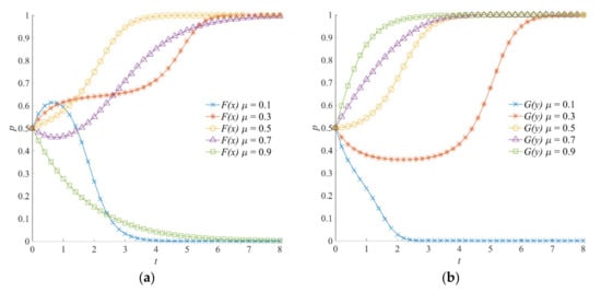 Evolution trajectory of the emergency incentive game system under different values of the local government’s incentive intensity. (a) The influence of μ on the evolution of the local government’s strategy. (b) The influence of μ on the evolution of social organizations’ strategies.