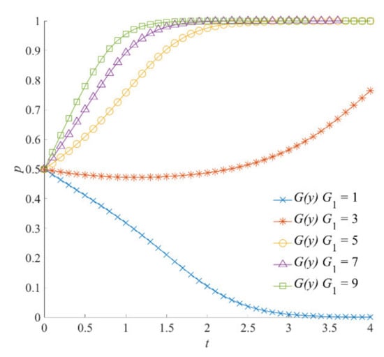 Under different compensation levels dispensed by the local government, the evolution results of the social organizations’ participation strategies are shown in Figure 5. When G1 = 1, the social organizations involved in natural hazard emergency responses need to pay large costs for emergency operations and fail to obtain sufficient fund compensation and material compensation. In this case, the negative participation strategy is the evolutionarily stable strategy of social organizations. When G1 = 3, the perception of the compensation benefits of social organizations increases and the enthusiasm of social organizations for choosing a positive participation strategy is also enhanced. As the evolution time increases, it converges to y = 1. Furthermore, when G1 is 5, 7, or 9, social organizations show greater initiative for participating in emergency operations. The evolutionary results of social organizations’ strategy selection all indicate positive participation strategies. Noticeably, when G1 = 9, the evolution time of social organizations toward a positive participation strategy is the shortest and the fastest.