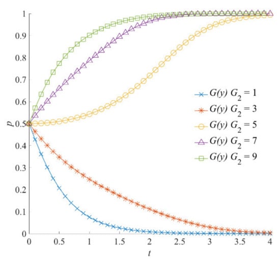 Under different reward levels dispensed by the local government, the evolutionary trajectories of the social organizations’ participation strategies are shown in Figure 6. With the increase in G2, the participation strategy of social organizations shows a shift from negative to positive. When social organizations choose a positive participation strategy, they can obtain certain economic rewards from the local government. Therefore, the effect of the local government’s incentive G2 on the social organizations’ strategy selection is different from that of G1. On the contrary, when G1 is 1 and 3, social organizations show a shift from a negative to a positive strategy; however, the transformation path of G2 is between the values of 3 and 5. On the contrary, the evolution of social organizations’ participation strategy to stable strategy in G1 is faster than that in G2. In conclusion, this shows that the promotion of G2 has little influence on the change in social organizations’ strategies.
