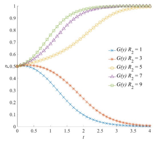 The simulation results of social organizations’ strategies, when the social reputation benefits obtained by social organizations R2 are 1, 3, 5, 7, and 9, are shown in Figure 7. When R2 is 1 and 3, social organizations are more likely to choose a negative participation strategy. With the increase in simulation time, the participation strategy of social organizations converges to y = 1. When R2 is set to 5, 7, and 9, social organizations tend to choose a positive participation strategy because they obtain higher social reputation benefits due to the local government’s recognition and publicity. However, by comparing Figure 5, Figure 6 and Figure 7, it can be seen that the influence mechanism of R2’s promotion on social organizations’ strategy selection is different from that of G1 and G2. The influence effect of social reputation benefits on social organizations’ strategy selection is lagging behind. At the same time, in the early stage of evolution, there is a delay in the strategy evolution of social organizations—a temporary stall. This shows that the compensation and reward given by the local government have a more direct impact on the enthusiasm of social organizations to participate in the emergency response to natural hazards.