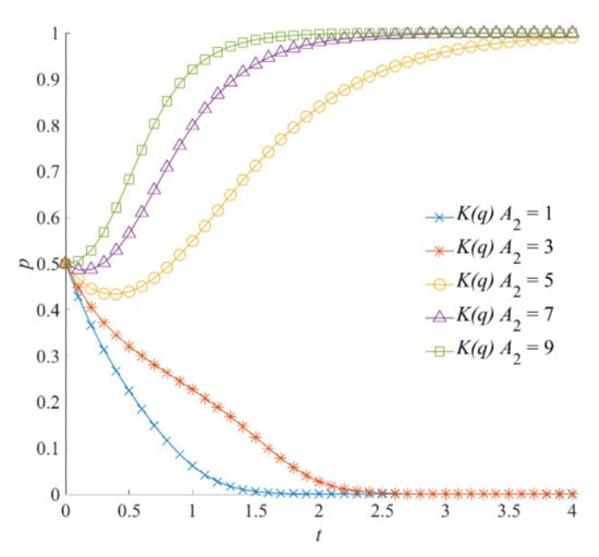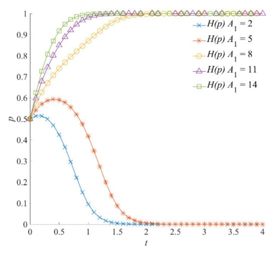 The results of the impact of emergency capital stock A1 on the strategy evolution of the local government are shown in Figure 12. When A1 is high, the local government more effectively implements the preparation of emergency plans and emergency rescue drills in the linkage of emergency preparedness. At this point, higher institutional capital stock and trust capital stock are formed. With the increase in emergency capital stock A1, the costs for the local government in natural hazard emergency responses and operations decrease accordingly. When A1 is 8, 11, and 14, the local government’s emergency strategy converges to p = 1. At the same time, when A1 = 2 or A1 = 5, the emergency capital stock formed by the local government in the linkage of emergency preparedness is insufficient. Although the local government chooses a positive emergency strategy due to the emergency needs and the responsibility requirements in the early stage of evolution, this eventually changes to negative emergency strategy due to the high costs of emergency operations.