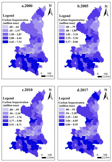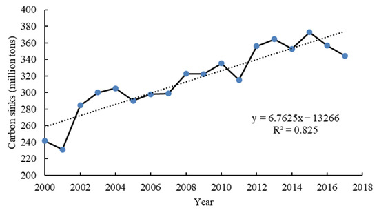- The temporal change of carbon sinks in Shaanxi Province showed an overall upward trend. In 2017, carbon sinks increased by 42.69%, compared with 2000. Counties (districts) differed greatly in carbon sinks, showing the characteristics of “southern Shaanxi is the most, northern Shaanxi is the second, and the middle is few”.