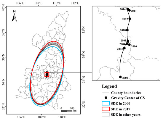- Visualization of the migration trajectory of the center of gravity of carbon sinks in Shaanxi Province from 2000 to 2017, and use of the SDE to reflect the changes in its spatial distribution pattern.