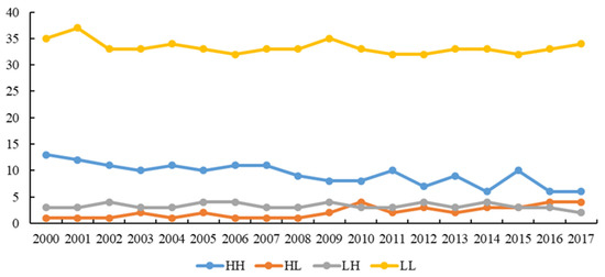 - According to the analysis in Figure 5, the characteristics of the local spatial pattern of carbon sink levels in Shaanxi Province from 2000 to 2017 can be classified into four categories. The first type is the high-value agglomeration type (HH); this type indicates that the local county (district) has a high carbon sink level, and its surrounding counties (districts) also have a high carbon sink level, showing a spatially associated agglomeration state of “high center and high surroundings”. The second type is the high-value convex type (HL); this type means that the local county (district) has a high carbon sink level, but its surrounding counties (districts) have a low carbon sink level, showing the characteristics of “high in the center and low in the surrounding area”, and it is a state of spatial non-equilibrium correlation aggregation. The third type is the low-value collapse type (LH), which means that the local county (district) has a low carbon sink level, but its neighboring counties (districts) have a high carbon sink level, showing the characteristics of “low center and high surroundings”, and it is a state of spatial non-equilibrium correlation aggregation. The fourth type is the low-value agglomeration type (LL); this type indicates that the local county (district) has a low carbon sink level, and its neighboring counties (districts) also have a low carbon sink level, showing the characteristics of “low center and low surroundings”, and it is a low-level average spatial correlation agglomeration state.