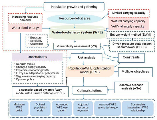 Therefore, the objective of this study was to develop an adaptive population–WFE (P-WEF) management framework (APRF) to confront the conflict between population development and the WFE supply system. Vulnerability assessment, uncertainty analysis, and systemic optimization methods can be incorporated into this APRF as hybrid method manner to deal with multiple uncertainties, which can confront the complexity of P-WFE for policymakers. This hybrid method has the following advantages: (a) the vulnerability of WFE is calculated using an entropy-based driver–pressure–state–response (E-DPSR) model to reflect the exposure, sensitivity, and adaptability caused by population growth, economic development, and resource governance; (b) a population–resources (P-WFE) optimization can be conducted to identify various policies associated with population adjustment, resource regulation, and technique improvement; (c) a scenario-based dynamic fuzzy model with Hurwicz criterion (SDFH) is developed and embedded into P-WFE optimization to deal with uncertainties expressed as possibility and probability distributions. Meanwhile, the risk preferences of policymakers can also be reflected in an elected manner. The developed APRF was applied to a real case study of Beijing city, which has characteristics of a large population and resource deficit. The results of WFE shortages and population–economy adjustments under various scenarios were obtained to identify the optimized P-WEF under various policies. Furthermore, the obtained results associated with resource vulnerability in various scenarios and benefit analysis under various risk levels were analyzed, reflecting the tradeoff between population development and WEF management. The above results are beneficial for adjusting current policies in a risk-averse and effective manner.