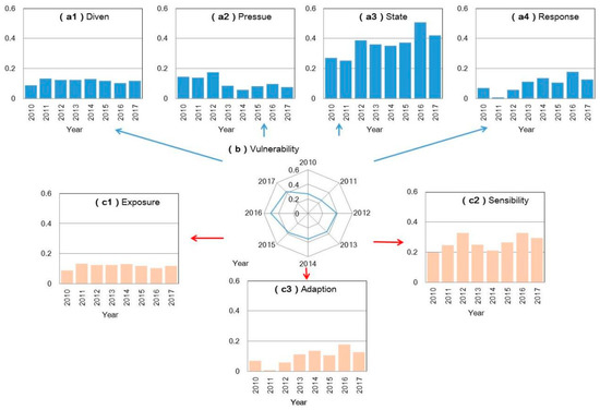 The vulnerability of resources (WEF) from 2000 to 2017 under S0 (without policy adjustment). ((a1–a4) are the measure of vulnerability based on Driver–Pressure–State–Response (DPSR) Model; (b) is the total vulnerability level; (c1–c3) are the exposure, sensitivity, and adaptability levels in vulnerability).