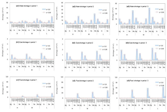 Total water–food–energy shortages among various sectors under S0 (α = 0.6 and β = 0.99) (agricultural sector denoted as “Ag”, industrial sector denoted as “In”, service sector denoted as “Se”, municipal sector denoted as “Mu”; heavy-consumption industry plant denoted as “HID”, medium-consumption industry plant denoted as “MID”, other industry plant denoted as “OID”, energy-supply industry plant denoted as “ESI”, traditional service industry plant denoted as “TSE”, other service industry plant denoted as “OSE”, environmental protection industry plant denoted as “GSE”, urban municipal consumption plant denoted as “URB”, rural consumption plant denoted as “RUR”; high level of resource availability denoted as “H”, medium level of resource availability denoted as “M”, low level of resource availability denoted as “L”) ((a1–a3) are water shortages in various periods; (b1–b3) are the coal shortages in various periods; (c1–c3) are the food shortages in various periods).
