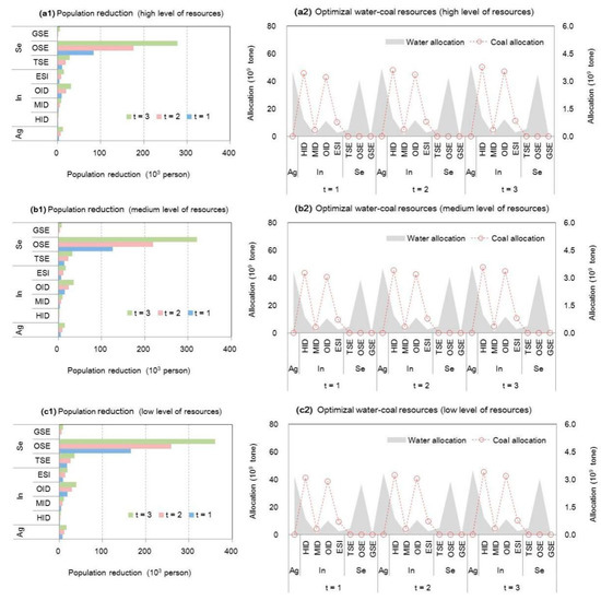 Population adjustments among different industrial plants based on water–coal optimization under S0 when α = 0.99 and β = 0.6 (agricultural sector denoted as “Ag”, industrial sector denoted as “In”, service sector denoted as “Se”, municipal sector denoted as “Mu”; heavy-consumption industry plant denoted as “HID”, medium-consumption industry plant denoted as “MID”, other industry plant denoted as “OID”, energy-supply industry plant denoted as “ESI”, traditional service industry plant denoted as “TSE”, other service industry plant denoted as “OSE”, environmental protection industry plant denoted as “GSE”, urban municipal consumption plant denoted as “URB”, rural consumption plant denoted as “RUR”) ((a1,a2) are population adjustment and corresponding optimized water-coal resources under high level of resources; (b1,b2) are population adjustment and corresponding optimized water-coal resources under medium level of resources; (c1,c2) are population adjustment and corresponding optimized water-coal resources under low level of resources).
